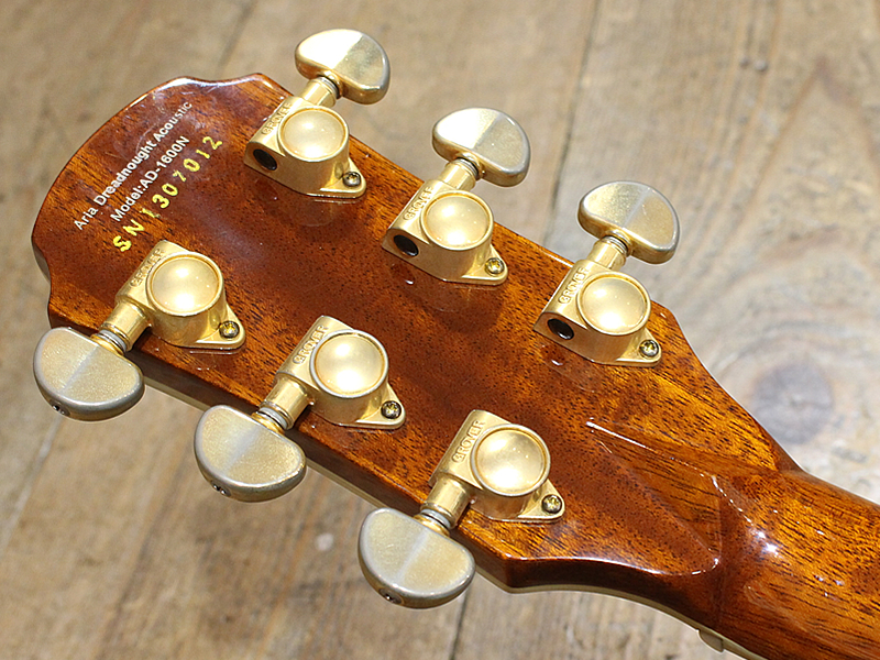 国内ブランドであるARIA。されど、なかなか情報が出てこないのが本機AD-1600Nです。2010年代に発売されていたとみられ、定価は16~17万程度であったと思われます。上位機種であったのは間違いなく、オール単板、エボニー指板&ブリッジなど贅沢なチョイスとなっております。Grover製ペグもよし。