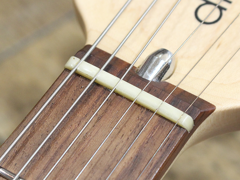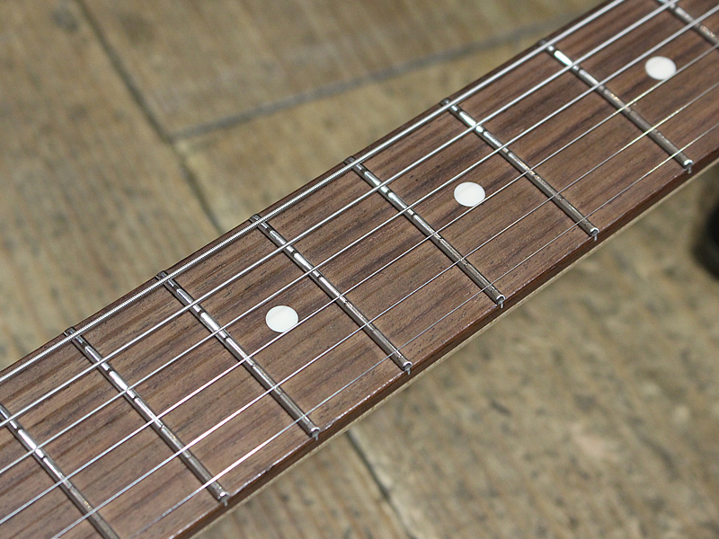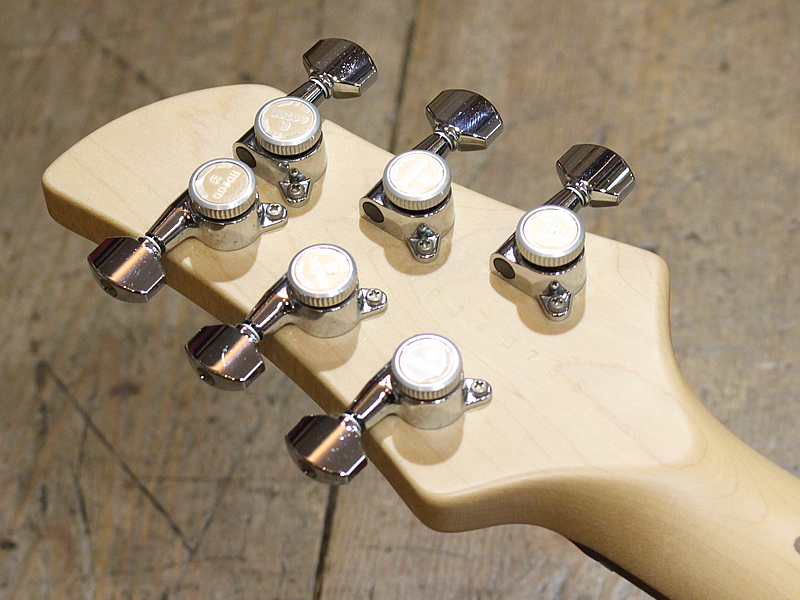 弦交換が容易なロックペグ、摩耗に強いステンレスフレット。ピックアップは通常自社モデルを搭載しておりますが、本機はBare Knuckle Pickups Nailbombに交換されています。ミニスイッチはタップスイッチです。ノブはボリュームとトーンです。