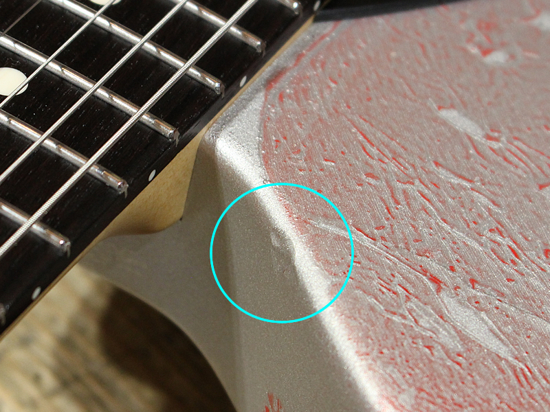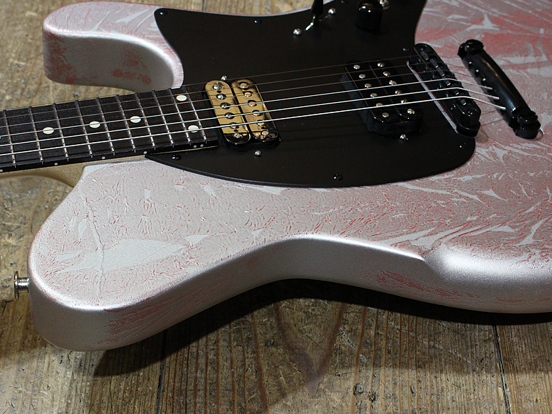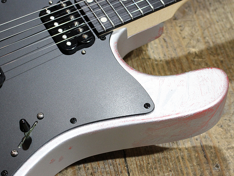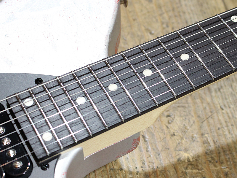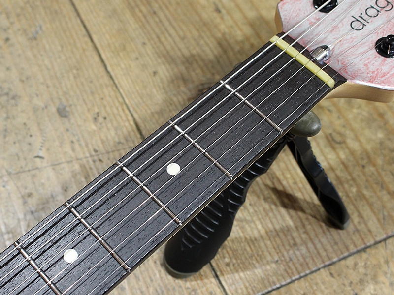 国産ハイエンドギターブランド「dragonfly」。看板モデルでもあるBORDERです。シルバーにレッドをラップ塗装して、タダものではない雰囲気がしている楽器店オーダー仕様です。スケールは通常のロングスケール648mmより18mm長い、666mmスケールを採用、これが本モデルの一番のポイントといえるでしょう。従来のスケール長ではチューニングをドロップした際に、張り、テンションが緩くなり、ピッチの揺らぎが気になったりします。たった18mm、されど18mm長いだけでその悩みを解消したのがこの666mmスケールです。