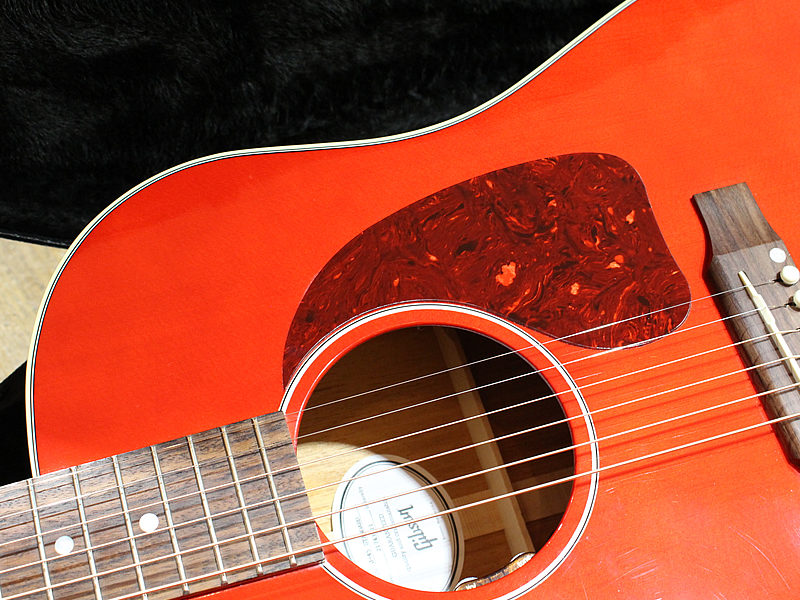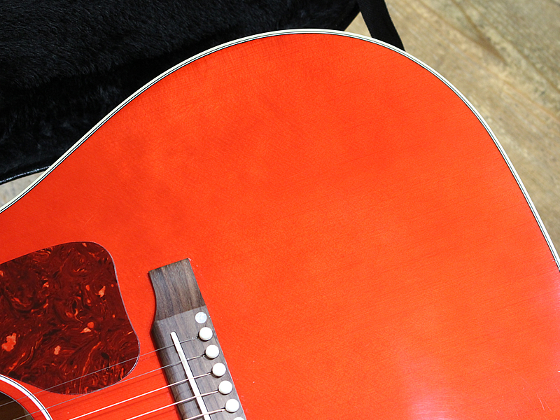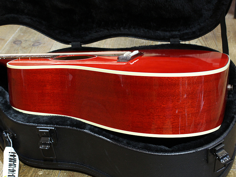 2023年製造。アコースティックの王道中の王道、ギブソンJ-45です。王道じゃないのはカラーがチェリーである点です。ワインレッドはたまにあれど、鮮やかで眩しいチェリーは珍しめ。ピックガードがべっ甲柄なのも締まりがあってよし。ピックアップはいつものL.R.Baggs Element VTCを搭載。安定したサウンドでライブも安心です。