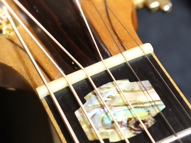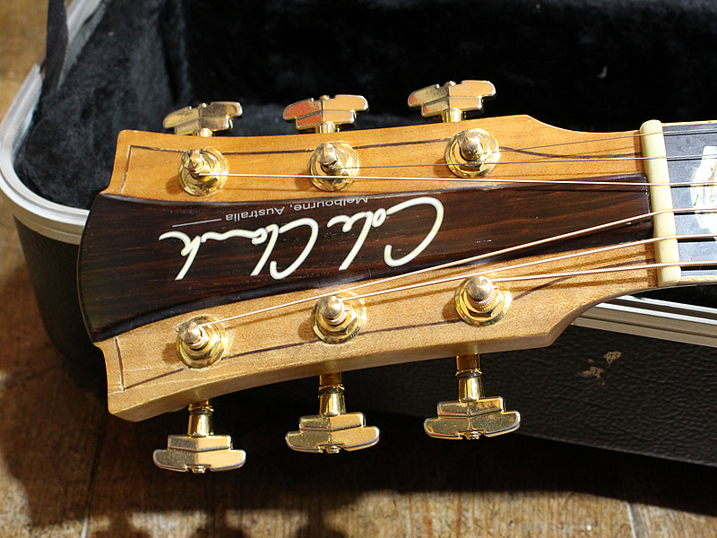 Bunyaという、Cole Clarkではメジャーなトップ材で、スプルースよりも18%強度に優れており、音響的にも伸びやかなことで採用されています。サイドバックはローズウッドです。指板はエボニー。ネックはマホガニー、に見えますがQueensland Maple。ブライトで晴れやかなサウンドが特徴的です。