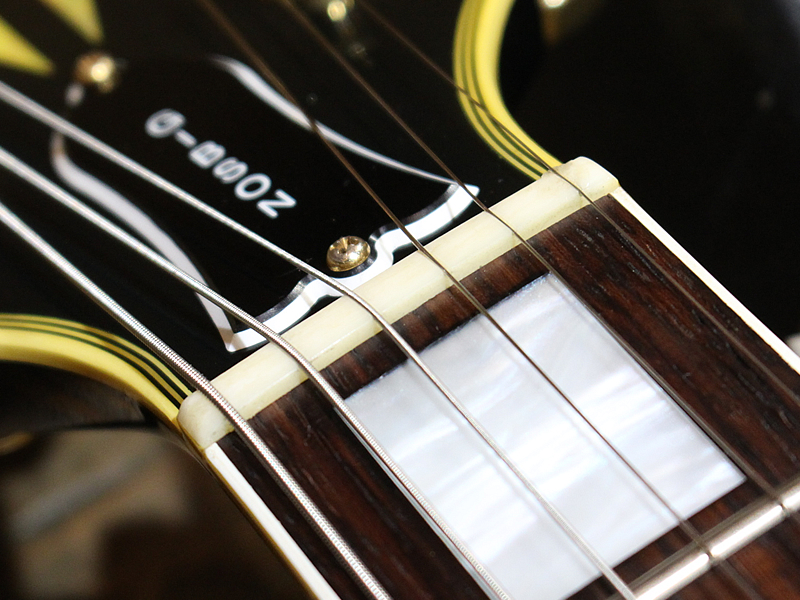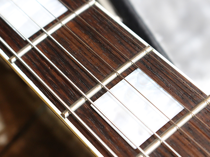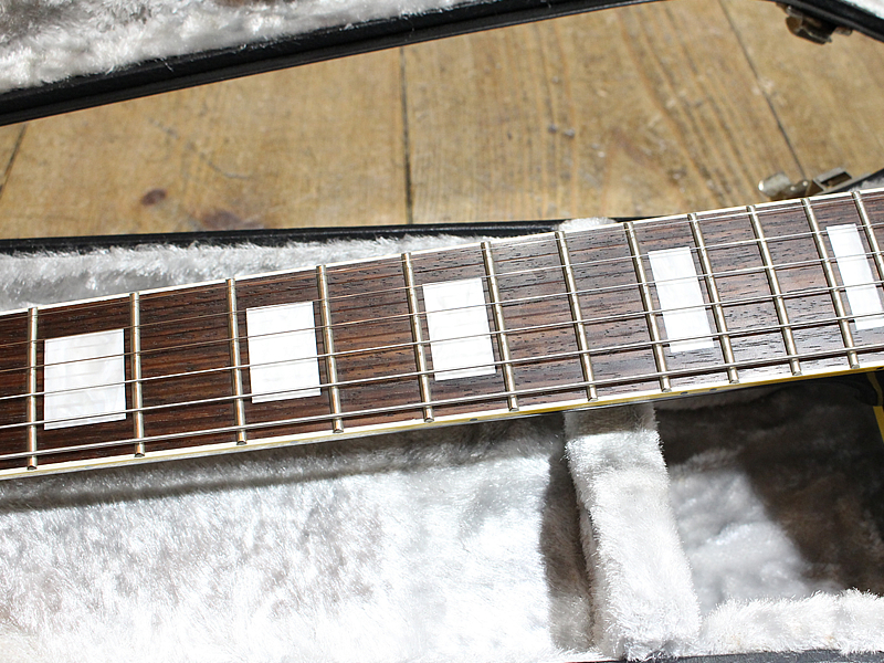 ラッカーは往年のニトロセルロースラッカーではなく、アクリルラッカーというものです。バインディングやインレイなどは予めイエローニングが施されており、長年経た雰囲気が出ております。ディープジョイントによるダイレクトな振動が心地よい響き。ハードに歪ませてもタイトでご機嫌なロックサウンドを鳴らしてくれます。ピックアップはアルニコVのオリジナルハムバッカーを搭載。クリアでダイナミクスの幅も広いキャラクターです。